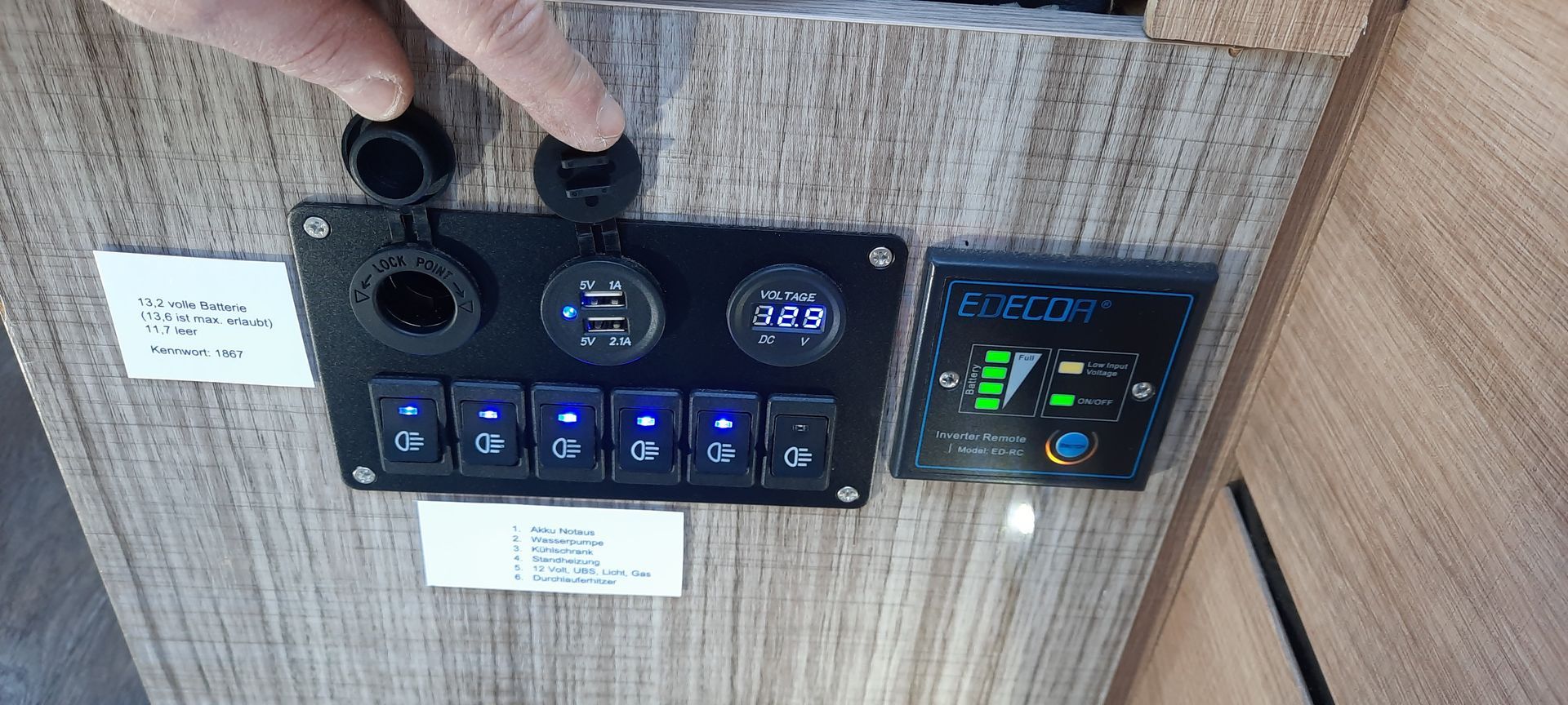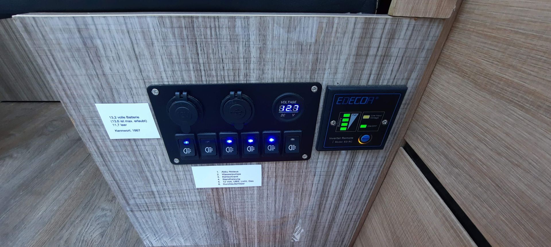 - Zentralschaltsteuerung (alle Verbraucher separat ansteuerbar: Licht, Kühlschrank, Wasserpumpe, Standheizung, Durchlauferhitzer)